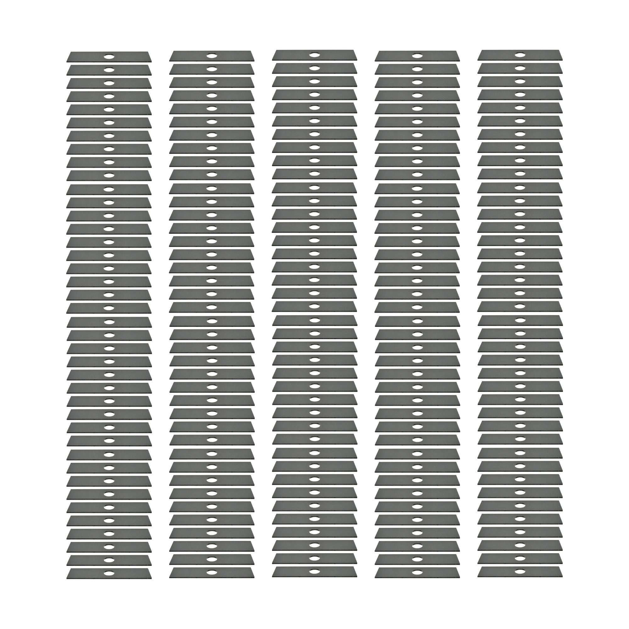 Set of 200 Heat-Treated, unsharpened edger blades that are 8 inches long with a 1-inch diameter center hole. The thickness is 0.118" (3mm).