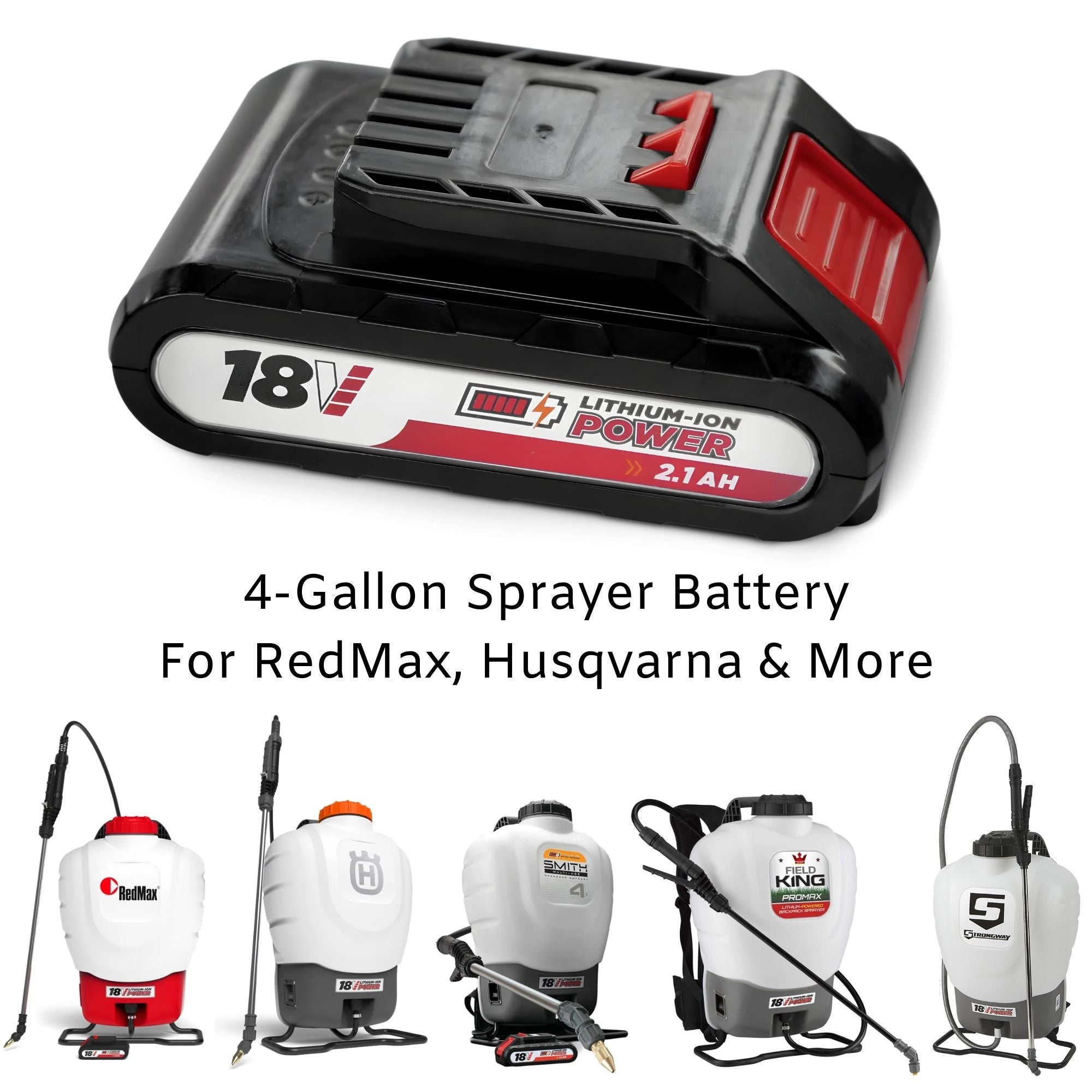OEM replacement 18V 2.1Ah Lithium-Ion battery for 4-gallon backpack sprayers made by Husqvarna and RedMax.