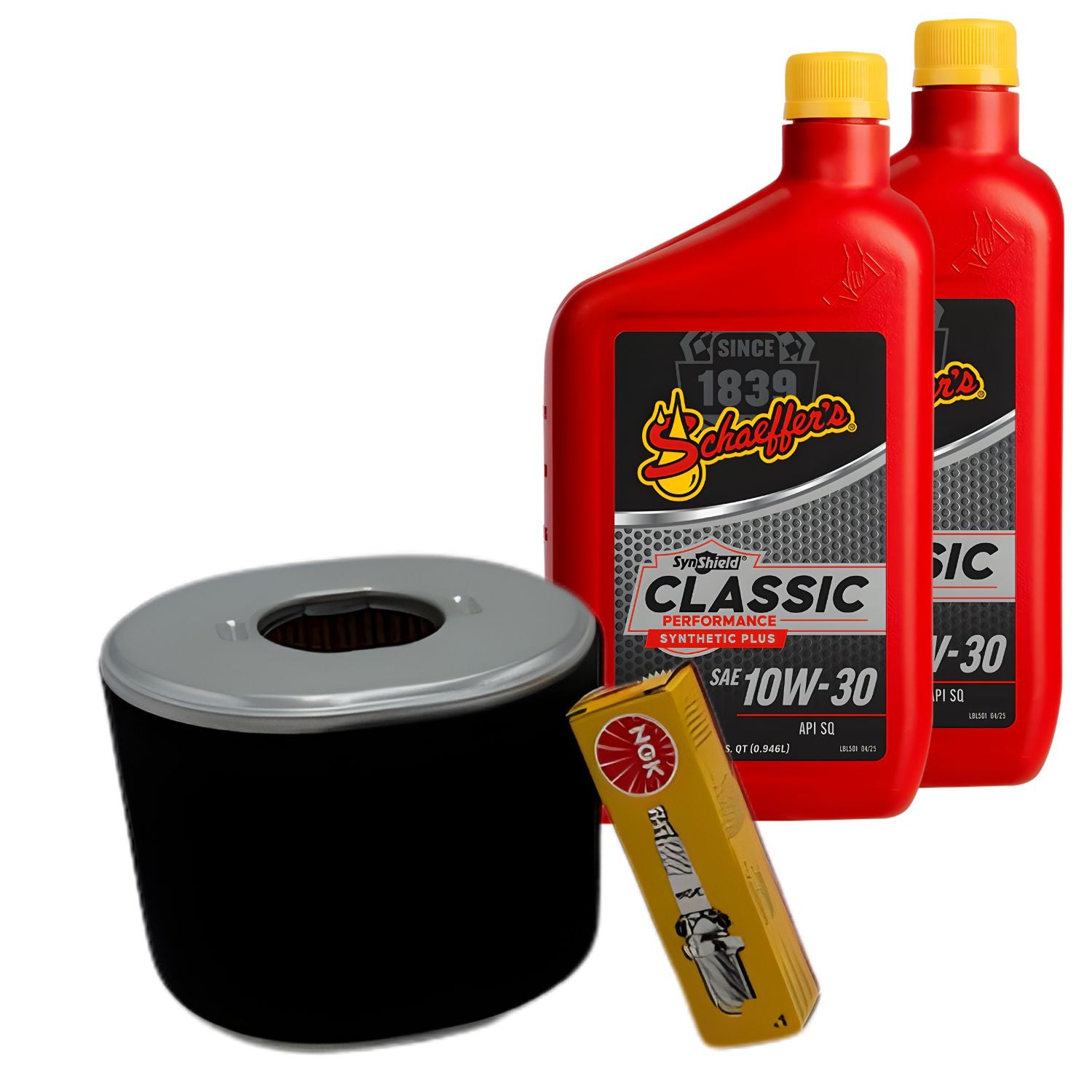 The kit includes 2 quarts of Schaeffer's 10W-30 oil that exceeds Honda requirements, a replacement air filter with pre-filter wrap, and an authentic NGK BPR6ES spark plug.