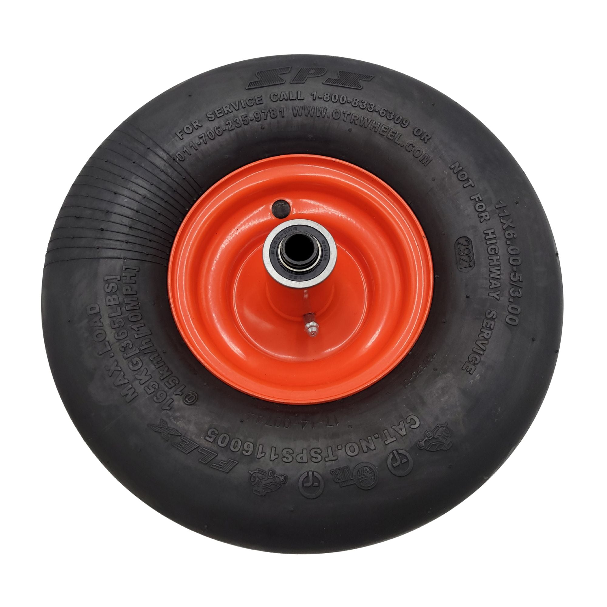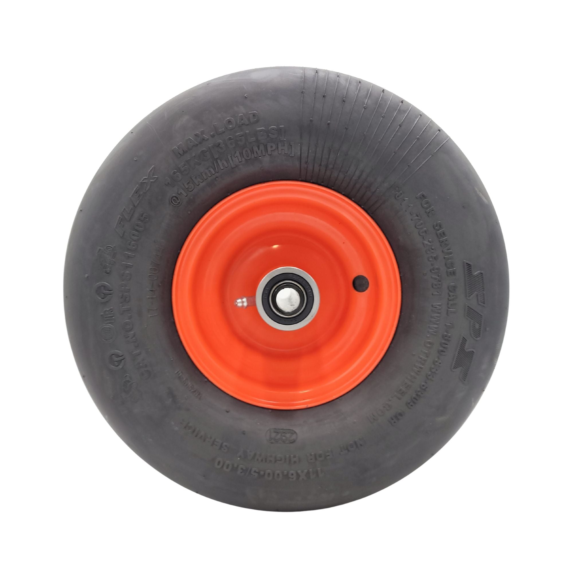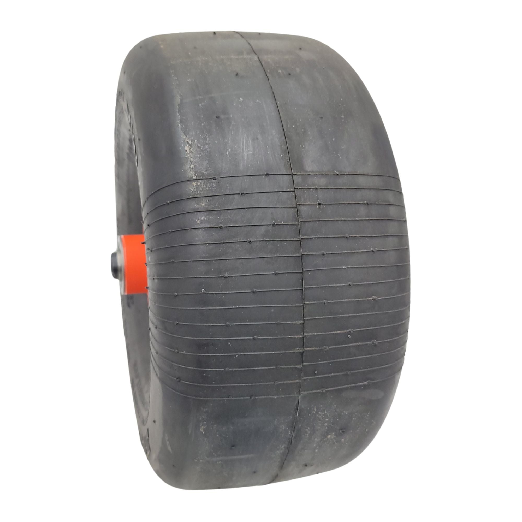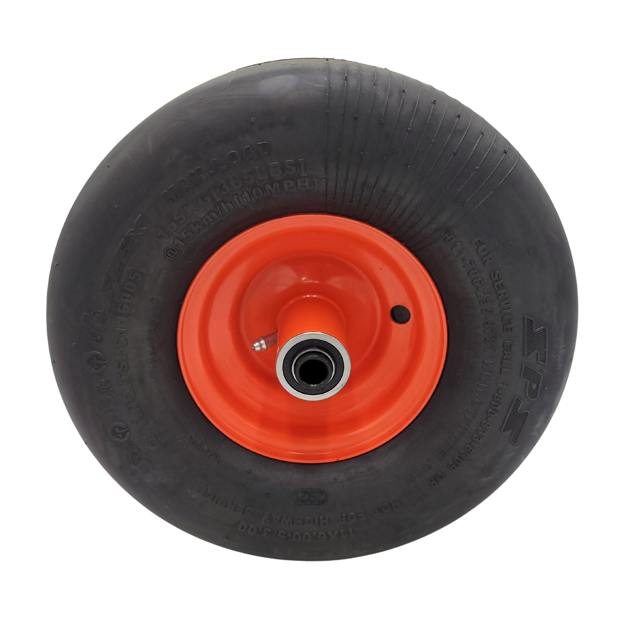 11x6.00-5 flat-free smooth tread tire with the wheel painted Bad Boy orange for most 2011-2019 Bad Boy MZ Magnum models.