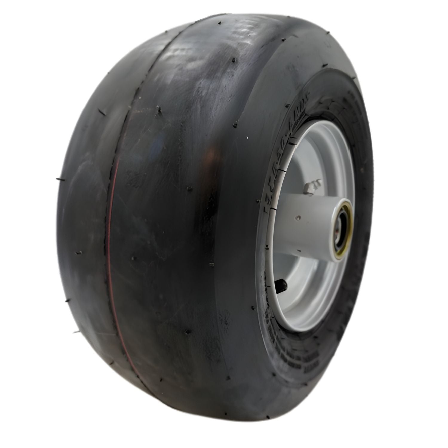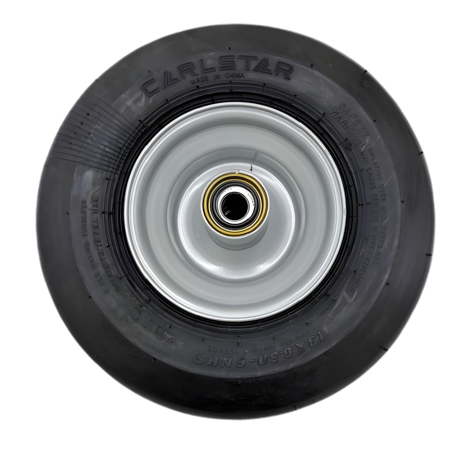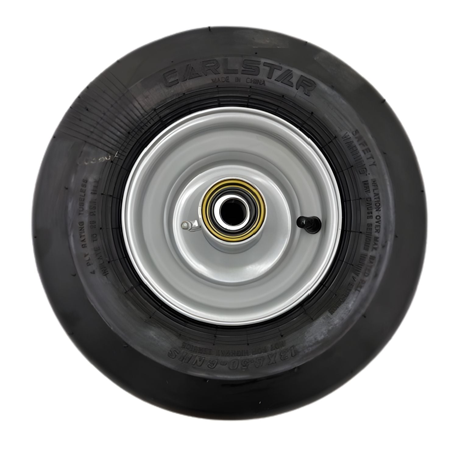 13x6.50-6 Carlstar (Carlisle) pneumatic tire (4 ply) smooth tread. The wheel is painted silver and comes with the race, bearing, and seal installed in the hub as shown.