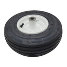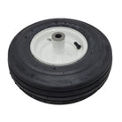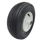 Air-filled ribbed tread 13x5.00-6 tire on a white rim with a 5-3/4" long hub with a 3/4" inner diameter.