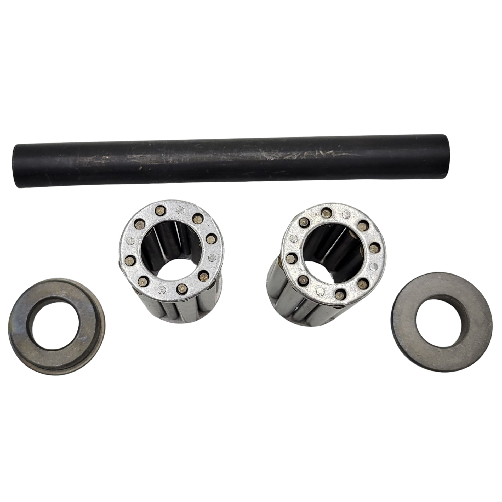 Wheel bearing kit for Exmark and Toro. Kits contains two Gravely Roller Cage Bearing, two Exmark 3322154, Husqvarna 539102484, & Hustler 772806 Retainer Bushing, and one Exmark 127-0068 and Toro 127-0068 Spanner Bushing.