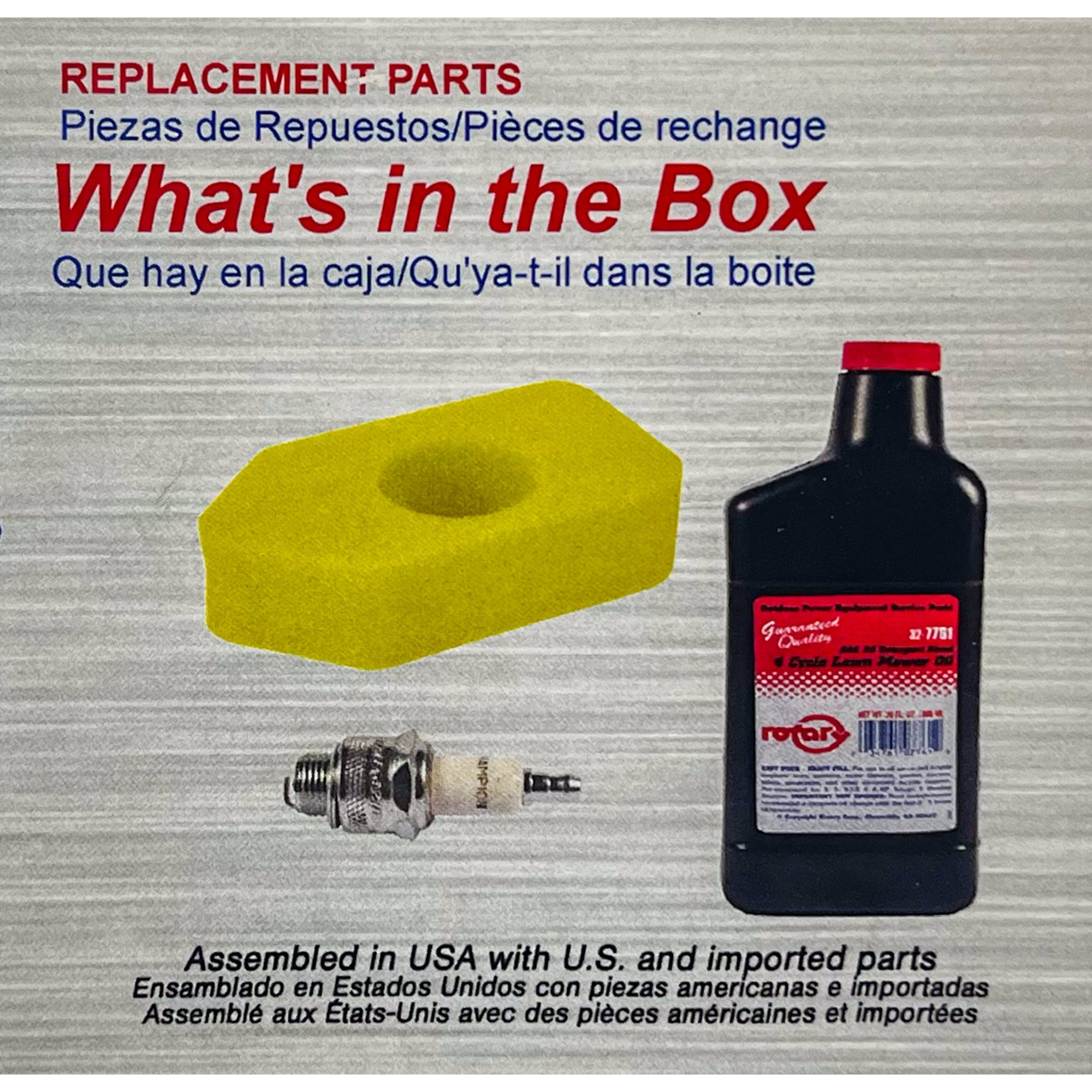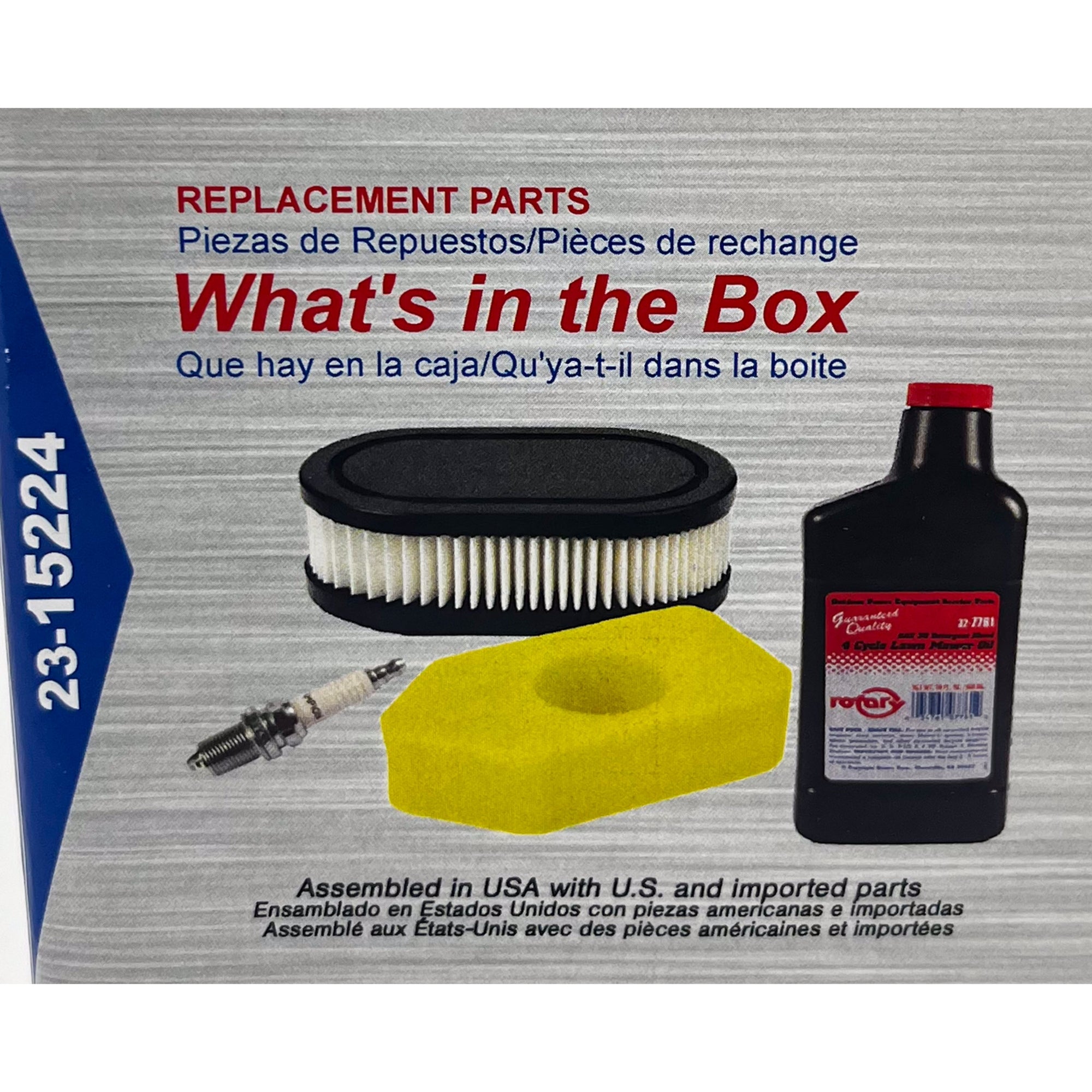 Engine Maintenance Kit for Briggs & Stratton fits 550E (X) and most 400[E] to 500[E]. Replaces 5138B. Contains 1 each Rotary item 11547 (Air Filter), 14364 (Air Filter), 11220 (Spark Plug), and 1 ea. 18 oz. bottle of SAE 30 (4 cycle oil).