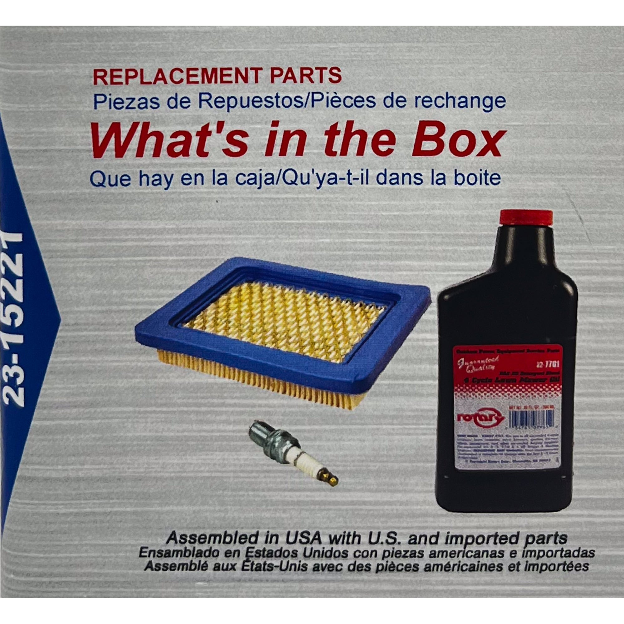 Engine Maintenance Kit for Briggs & Stratton fits Quantum. Replaces 5106 (A,B). Contains 1 each Rotary item 2838 (Air Filter), 6877 (Spark Plug), and 1 ea. 18 oz. bottle of SAE 30 (4 cycle oil).