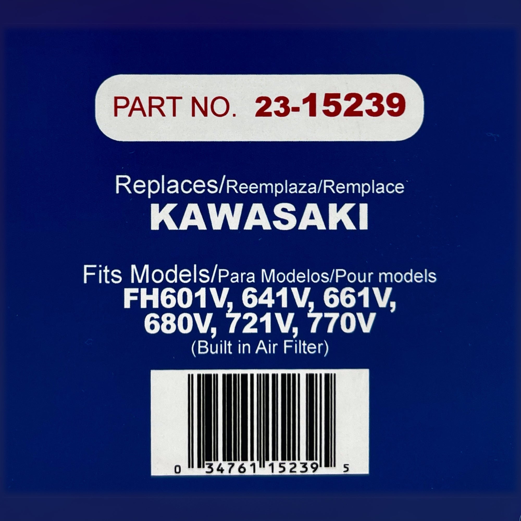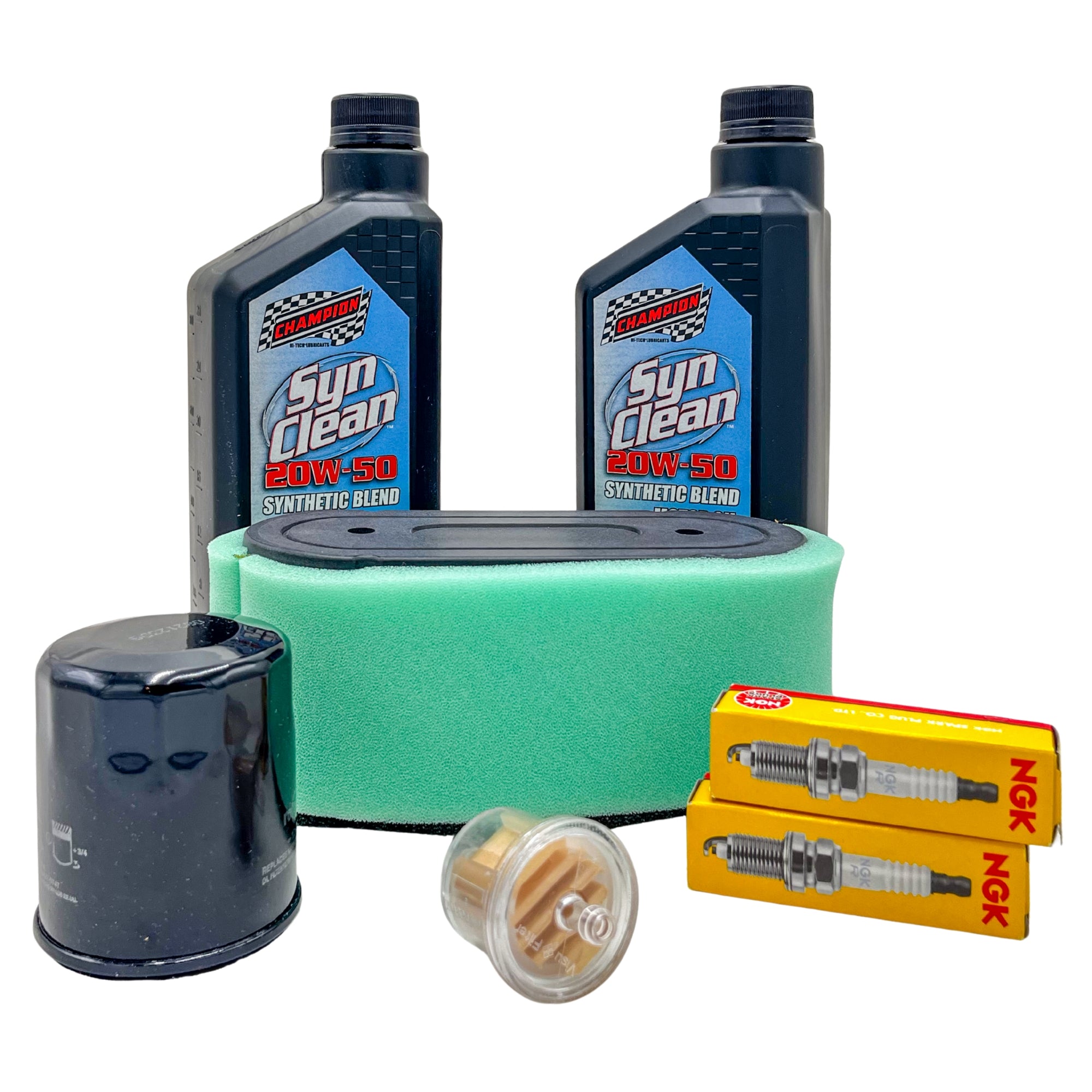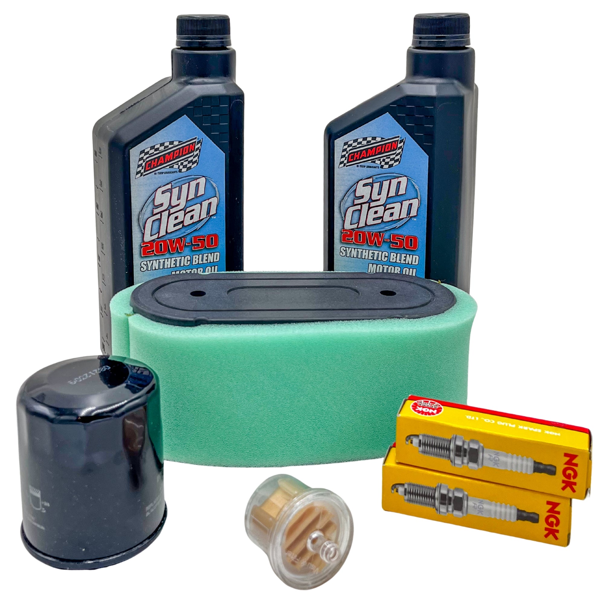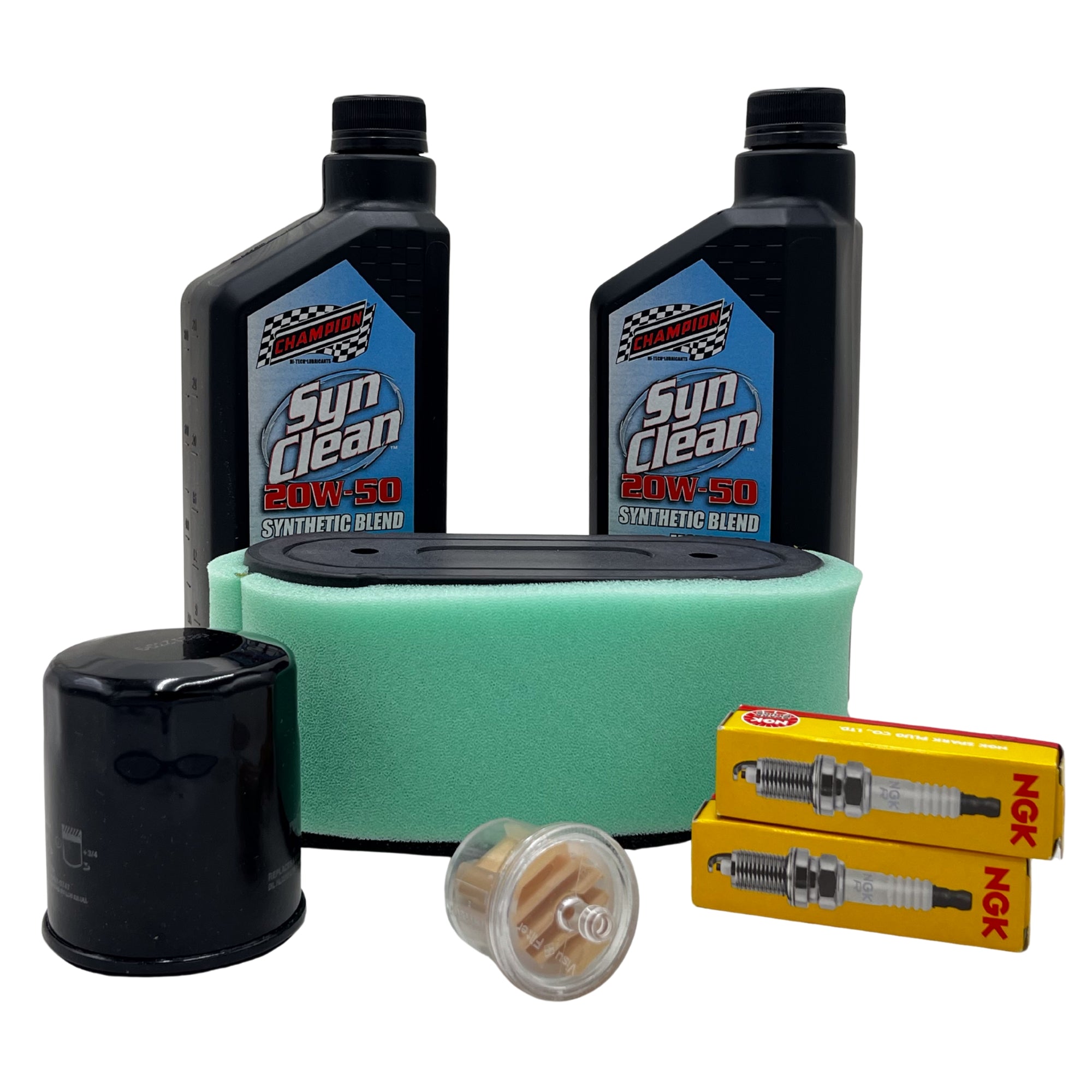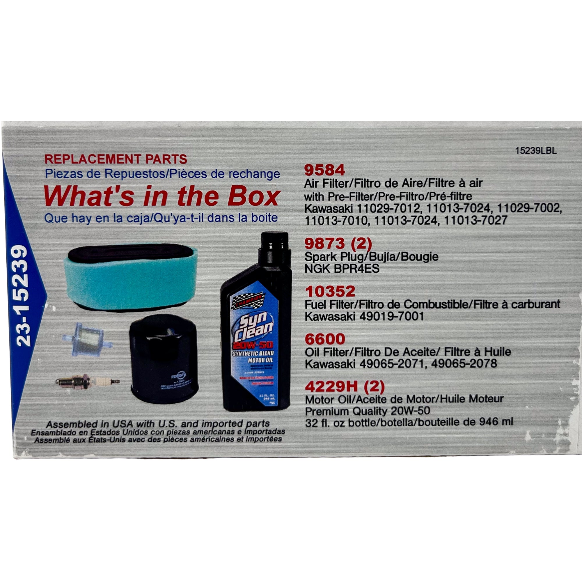 Kawasaki Engine Maintenance Kit for FH601V, 641V, 661V, 680V, 721V, 770V (Built in Air Filter). Replaces 99969-6407, 99969-6378. Contains 1 each Rotary 9584 (Air Filter), 12864 (Oil Filter), 10352 (Fuel Filter), 2 ea. 9873 (Spark Plug) and 2 quarts of 20W-50 engine oil.