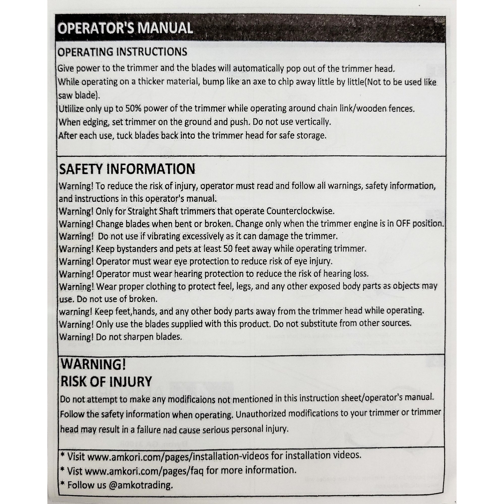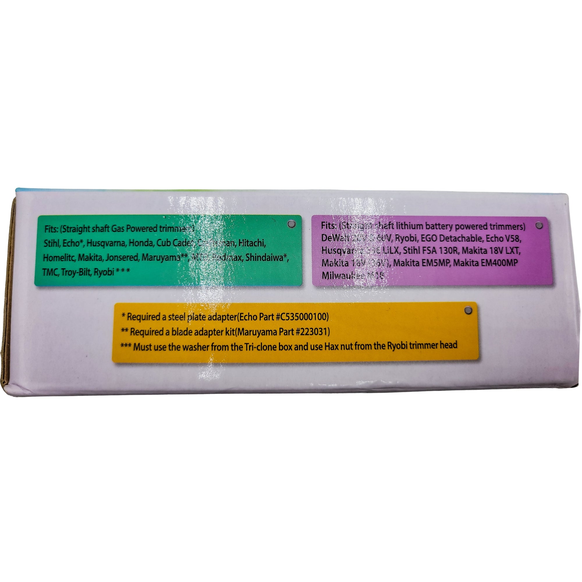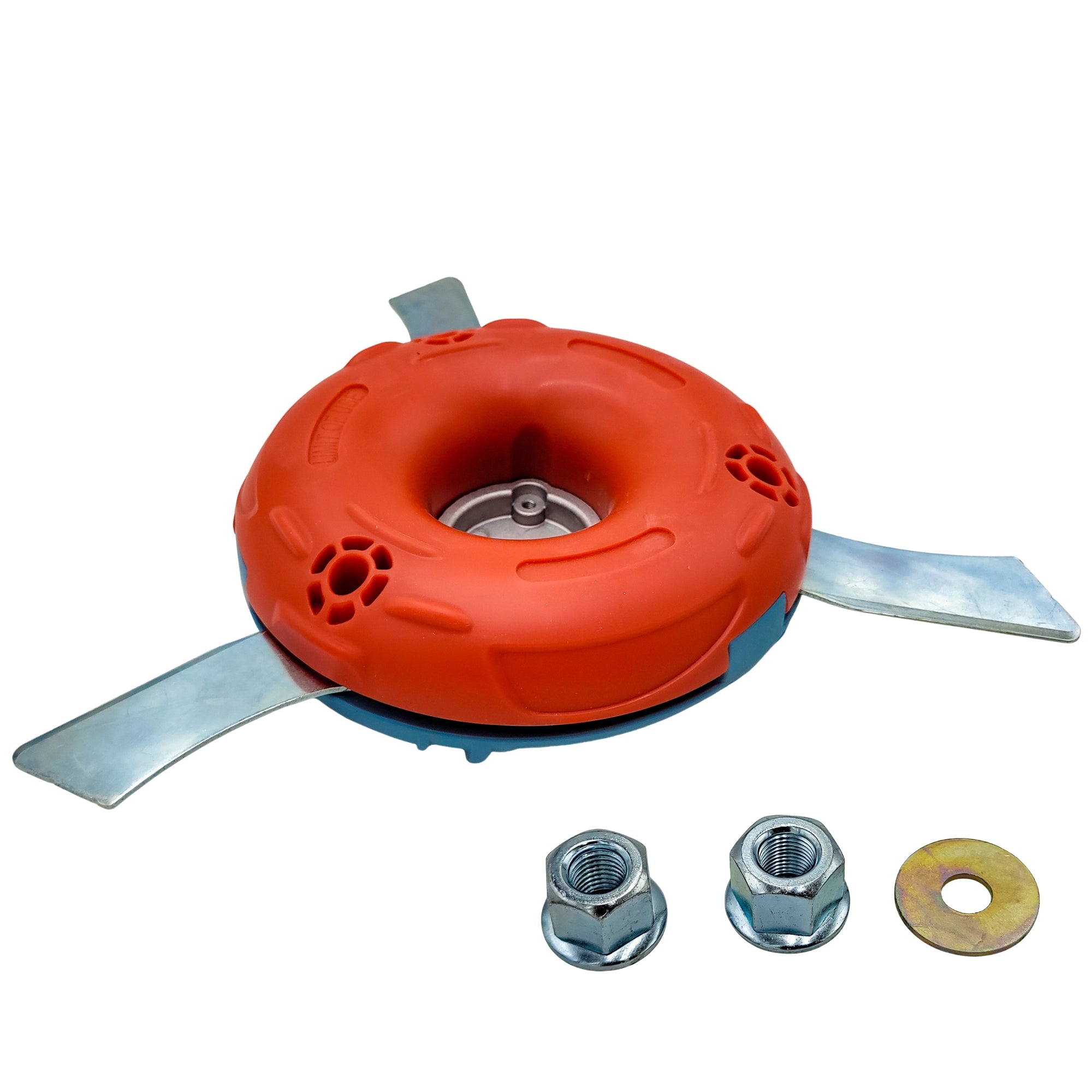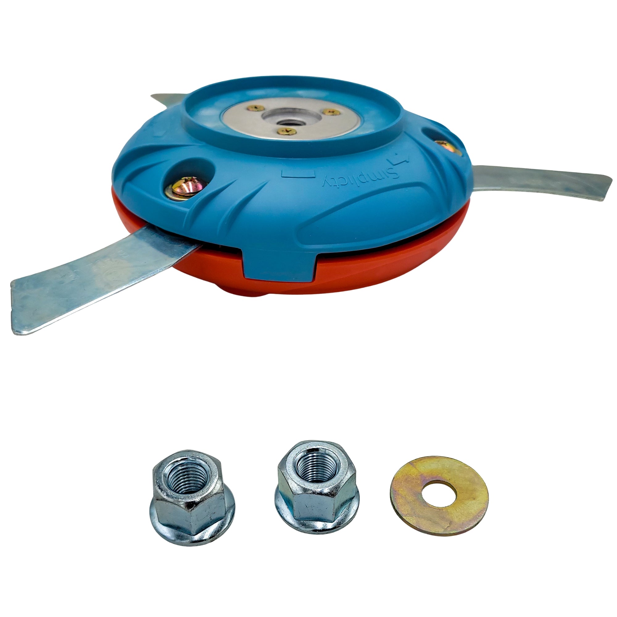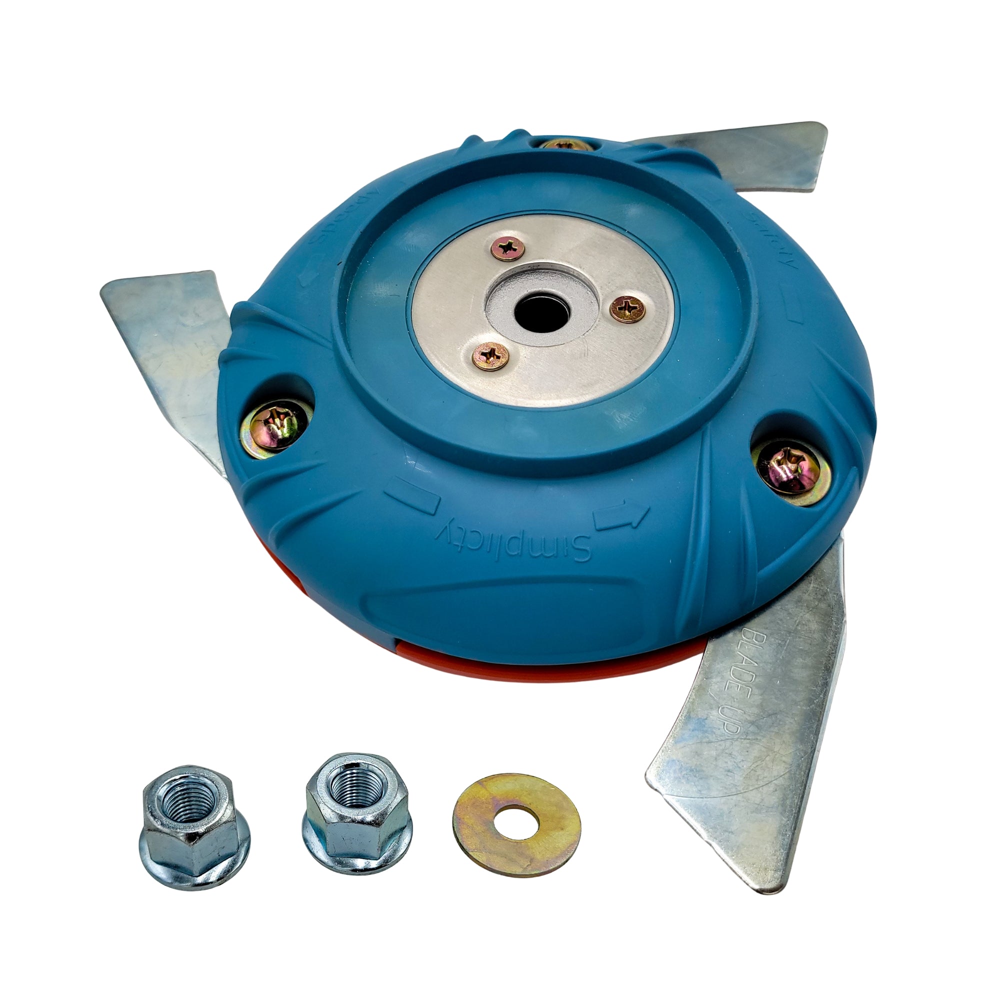 The trimmer head comes with 3 blades and 10mm x 1.0 and 10mm x 1.25 nuts for installation on most string trimmers.