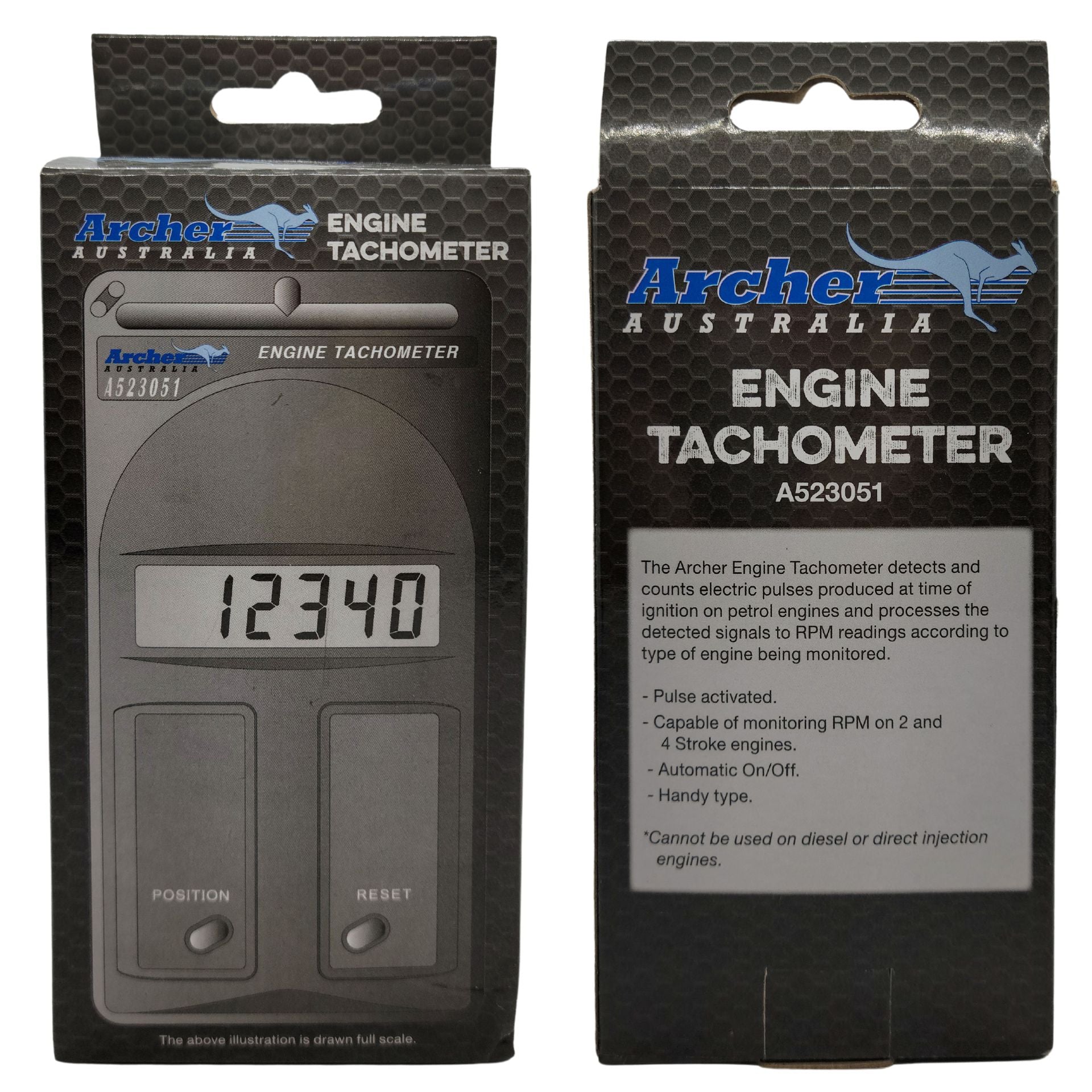 Measures RPM from 100 to 19,000 with +/- 10 RPM accuracy and a 1/2 second refresh rate.