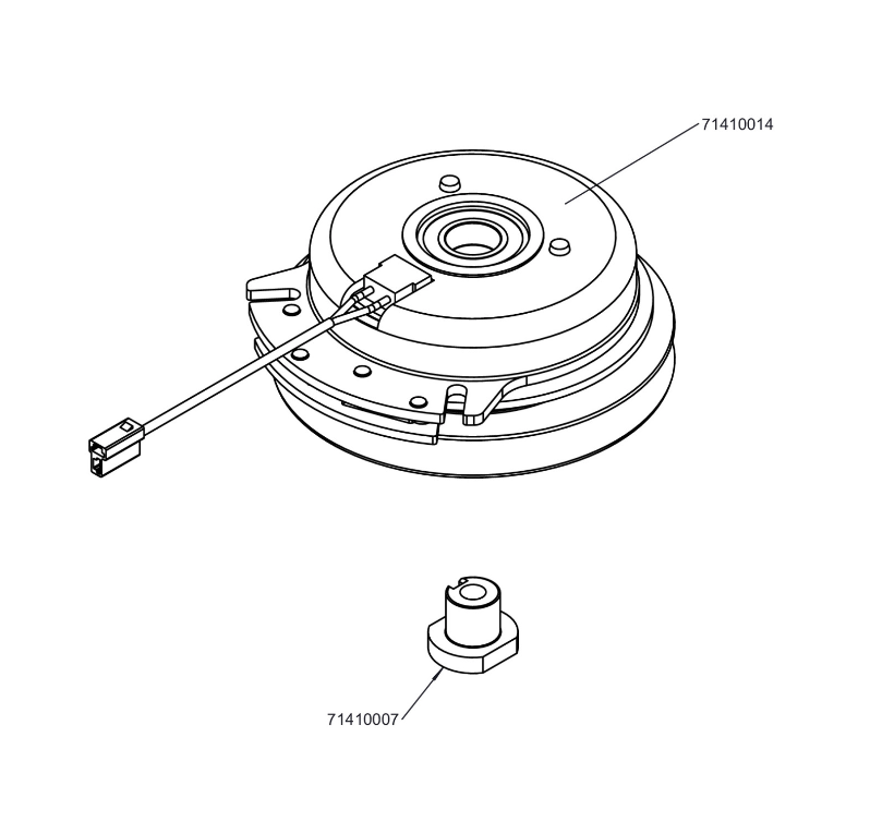 OEM replacement for Wright Manufacturing PTO Clutch part number 71410014, which has been superseded to 71410039.  The difference between these part numbers is that the newer part number, 71410039, has the wiring pigtail integrated into the clutch instead of being a pigtail with connections on both ends.  They are interchangeable.